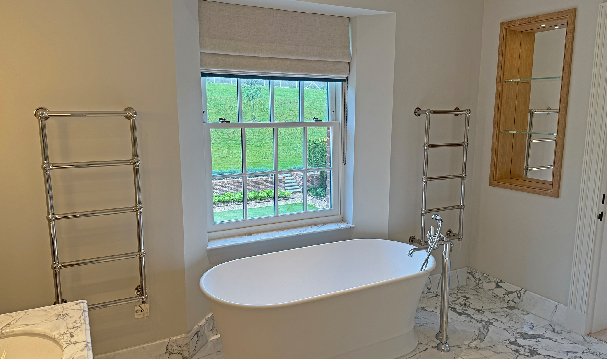 Picture a handcrafted staircase rising through a double-height hallway, finished in rich oak with glass balustrades. Imagine slim, floor-to-ceiling windows framing views across a garden or rural landscape, built from sustainable hardwood with high-performance glazing. Or a bold front door in a heritage green, surrounded by glazed side panels and finished with period-appropriate ironmongery.